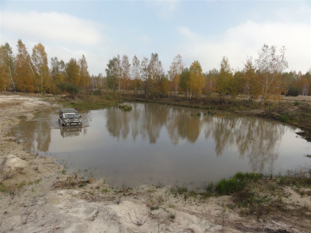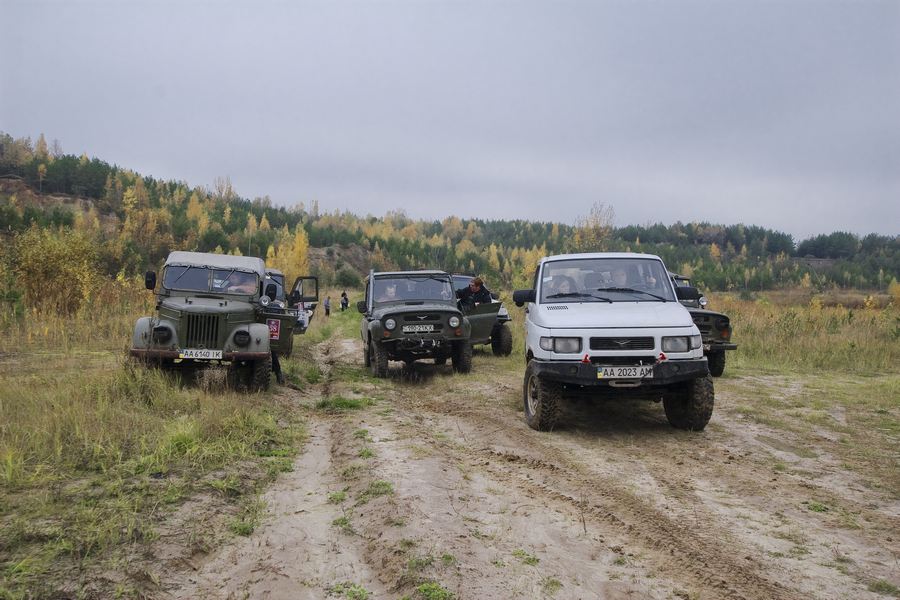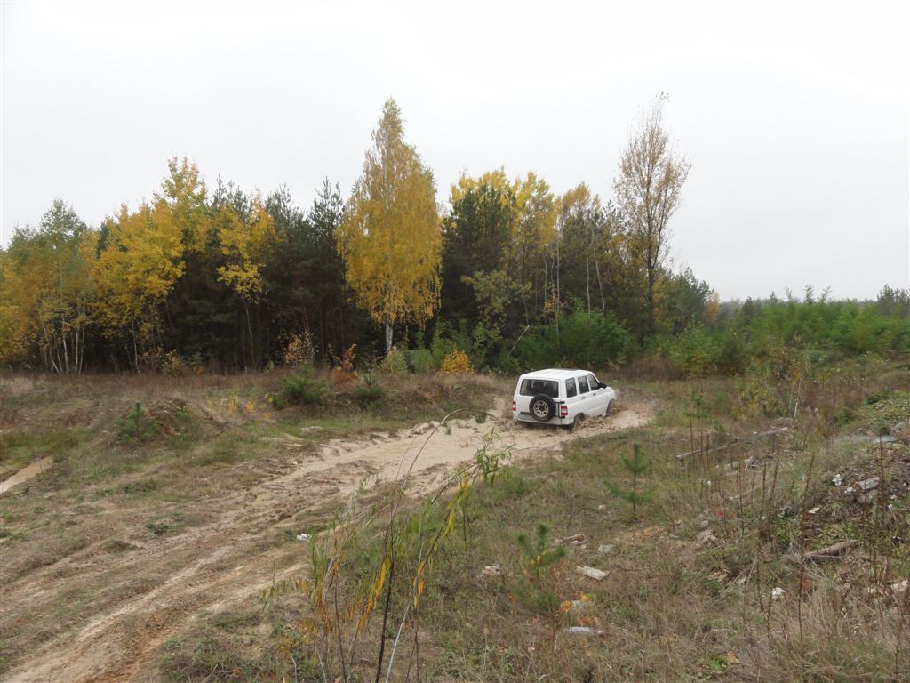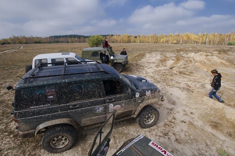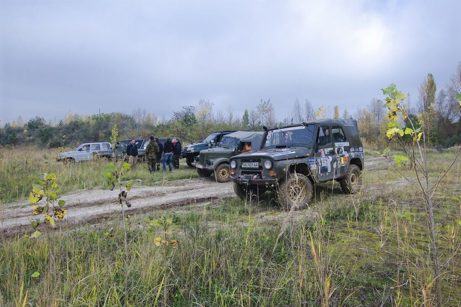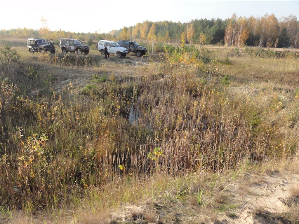 Первую часть разведки в предыдущие выходные мы достойно прохалявили, да не мы одни… Зато на вторую часть разведки явилось целых шесть экипажей: мы, Олекса, Катюха, ГАЗончик, Безвыходный и новенькие. Поехали смотреть по заранее намеченным местам. Перемежалось это конечно как обычно какими-то возгласами: А поехали в Дымер, Дебальцево, шут знает еще куда… Но опытных следопытов так просто с заданного направления не сбить. Задачей было найти такое место, чтобы и пол сотни машин разместилось без проблем и ландшафт для триала был зачетный. Ну как просто приехать посмотреть и всё? Нет, это неправильно, не спортивно и не по регламенту. Найти место подальше, лужу побольше, заехать поглубже и лебедиться до посинения… синело в нашем случае небо, утром была мряка, а день порадовал солнцем. Три недокарьера в районе Гостомеля.