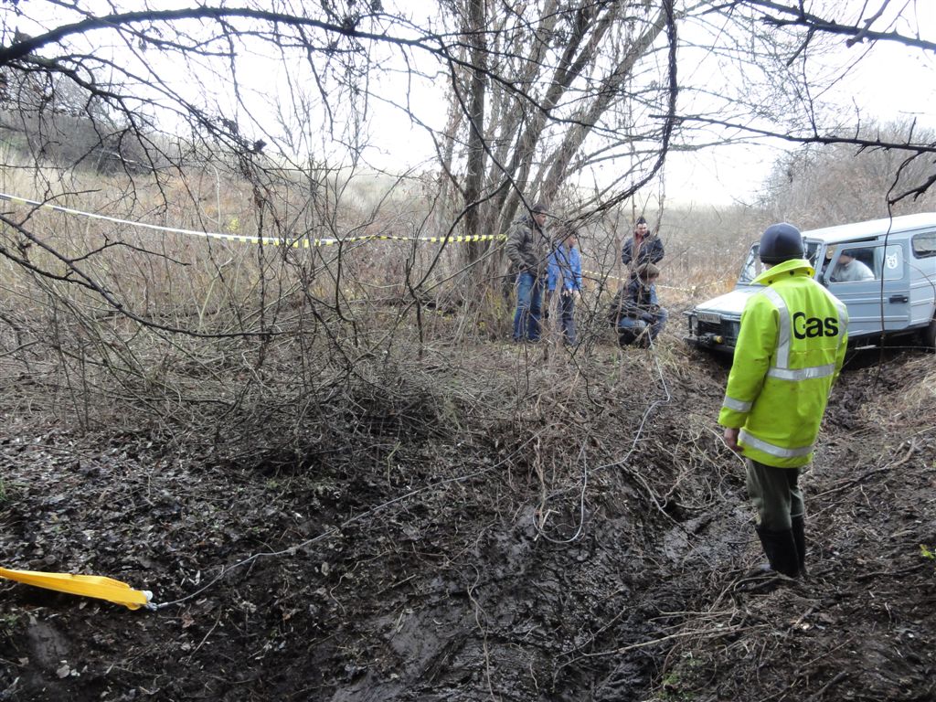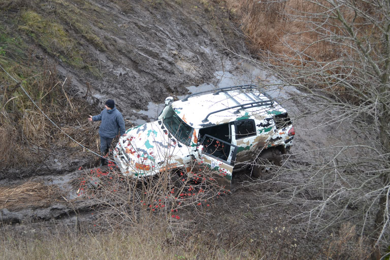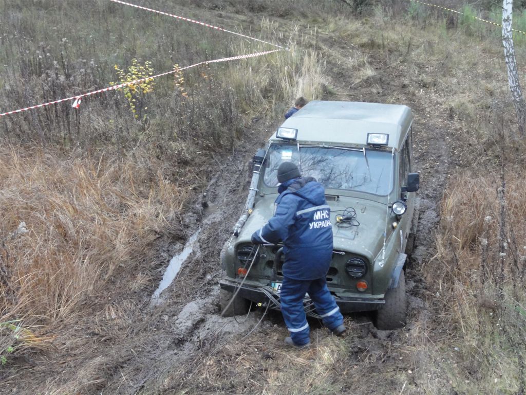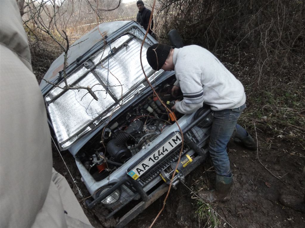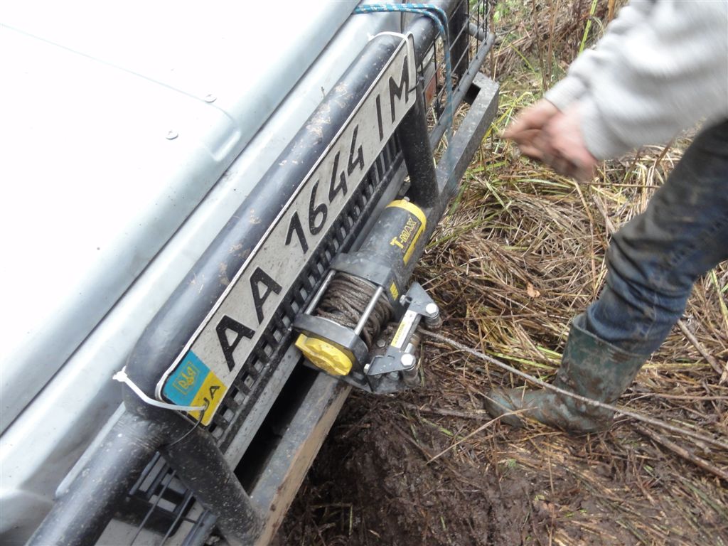 Барабан невеличкий, довжина троса менша, лебедилися за невеличке дерево праворуч із стропою на удавку, дерево таки не витримало: