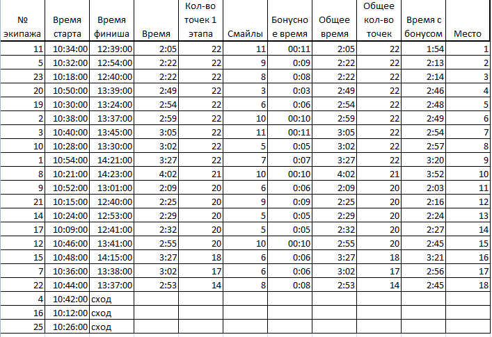 5.6. За превышение нормы времени до 30 минут экипаж пенализируется – 1минута минус -1 балл. За превышение нормы времени более 30 минут - Сход.