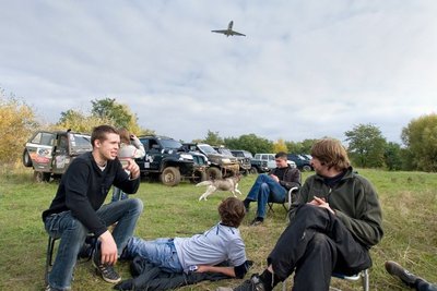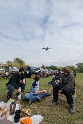 Вдоволь намесивши глинку мы поехали на уютную полянку возле аэропорта для продолжения банкета и услады желудков. Об этом месте хочется сказать пару слов отдельно. Какой ребенок в нашем советском детстве не мечтал стать космонавтом или хотя бы летчиком? какой мальчишка в детстве не хотел иметь самолет или хотя бы машину? последняя мечта у большинства присутствующих уже исполнилась, но замирание сердца от созерцания многотонных механизмов парящих над облаками все же осталось. Самолеты пролетали довольно низко, пару раз даже природная "аномалия" в виде воздушных локальных завихрений имела место, за чем с удовольствием наблюдали как дети так и взрослые.