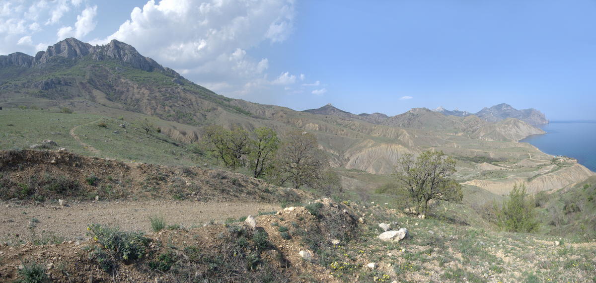 Итак, три дня лесом, два дня полем... Последние 10 км от Курортного до точки лагеря пробирались как уже говорила очень крутыми, но живописными спусками и подъемами. Место получилось на горе, где с одной стороны открывается вид на Лисью бухту, а с другой виден киногородок. Третья сторона - дорога к горам, которые почему-то кроме меня никого не привлекли для пешей прогулки.