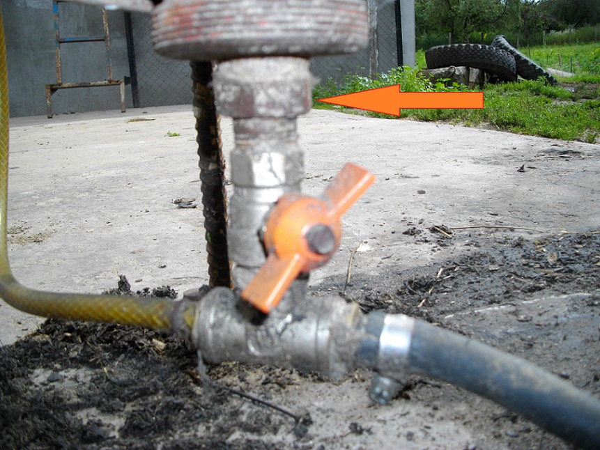 стрілкою показано ніпель конусний на 1/2" для вкручення в балон, в даному випадку балон перевенуто, а в низ балона вварено засипну горловину.