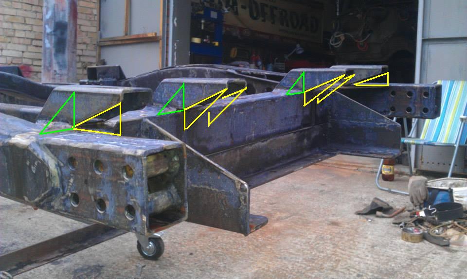 Второй момент - приваренные проставки к кронштейнам имеют открытый профиль в виде буквы "П" без ребер жесткости. У родных (стоящих на раме значительно ниже) их функцию выполняет продольная стенка самой рамы. А то что приварил под углом к вертикали (непонятно зачем) - несколько сомнительно с конструктивной точки зрения (+ к этому там будет грязь забиваться).