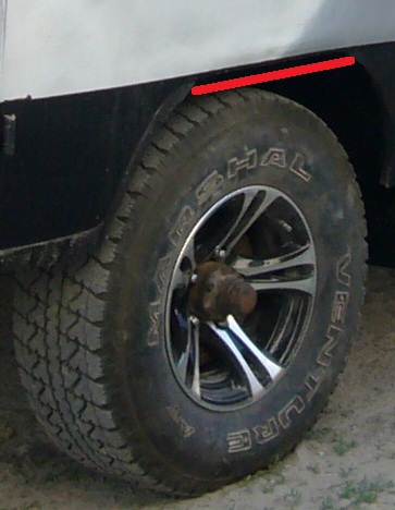Вот для этого на свои 31х10.5 я поставил диски с вылетом 0. Родные диски УАЗа имеют вылет -22, т.е. наружу. На крыле немного вырезал бортик снаружи, до горизонтальной плоскости. На фото красным выбелил, где был бортик до обрезания.