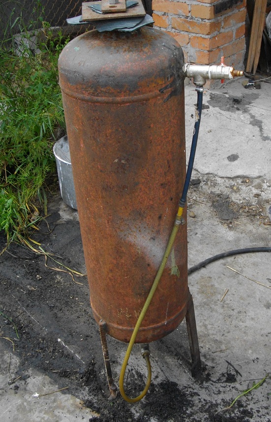 Отже. Даний апарат я виготовив ще 3 роки тому зі старого газового балону.в токаря я замовив ніпель конусний для вкручення в балон з переходом 1/2" різьбу, трубу 0,5 м. 1/2" з різьбами, та короткого ніпеля 1/2" з різьбами. придбав 3 крани 1/2", трійники 1/2" - 2шт, штуцера для зєднання шлангів 4 шт., шланг гумовий 10 м.штуцер для зєднання з компресором. всі деталі приварюються, скручуться і т.д.
