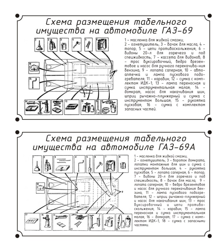табличка "Размещение табельного имущества на ГАЗ 69 (ГАЗ 69А)" - 100грн