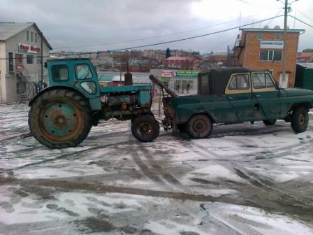 У нас по Сумах їздила звичайна буханка, за собою тягала хитру приспособу, одна вісь із кронштейном, закидають морду авто на цю хрєнь і тягнуть.